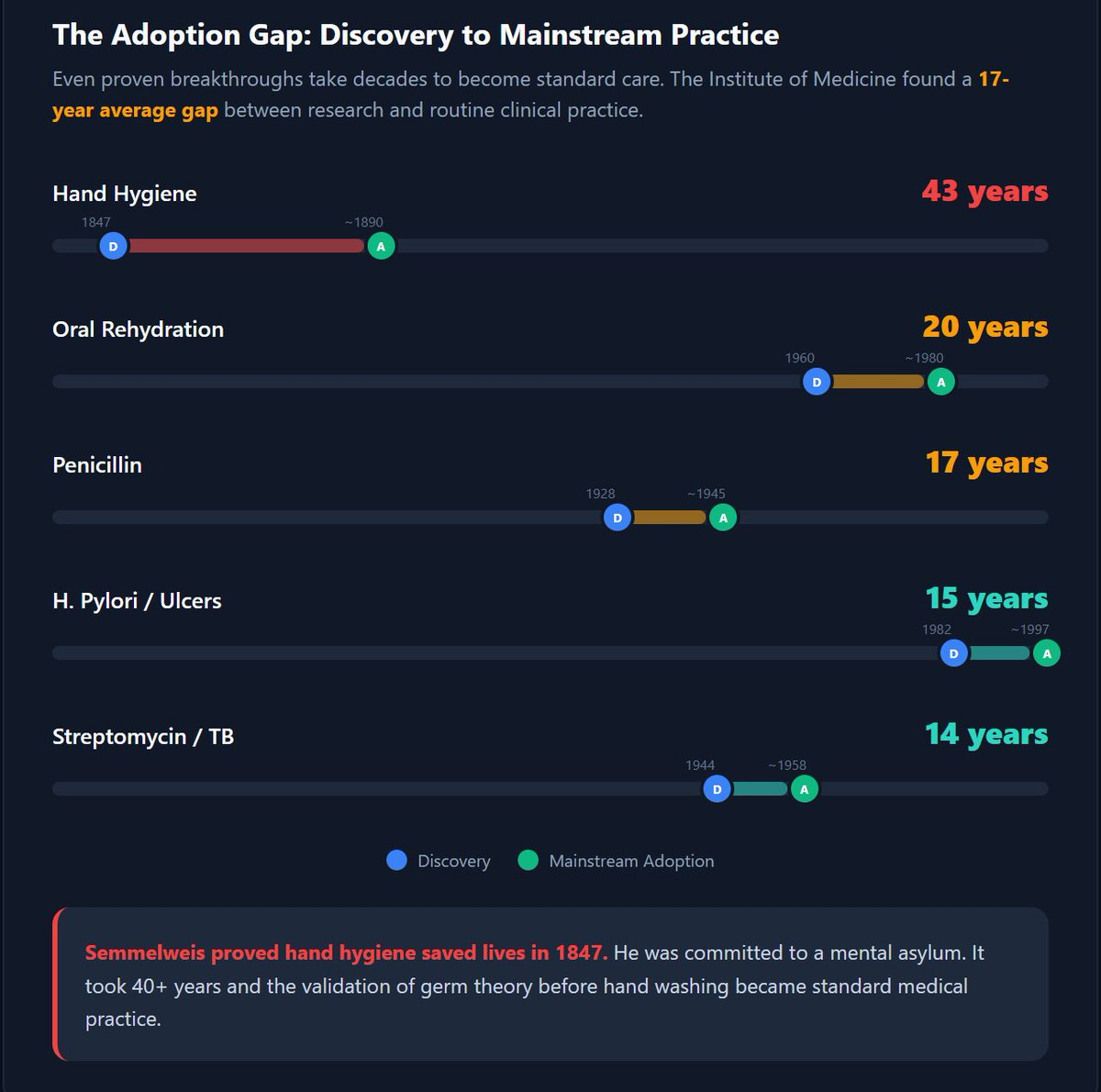 This is not a new problem. Throughout medical history, the gap between discovery and widespread adoption has been staggeringly long.