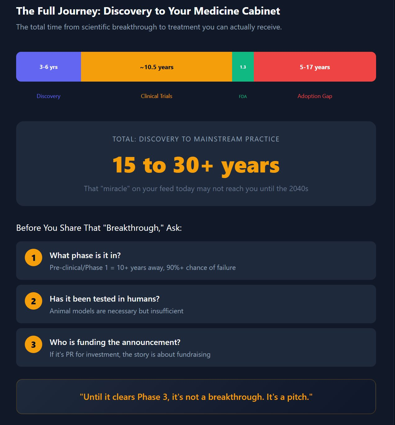 And even after approval, the 17-year adoption gap means the road from "proven" to "available at your local hospital" is longer than most people realize. The full journey from a scientist's eureka moment to a treatment you can actually receive can span two to three decades.