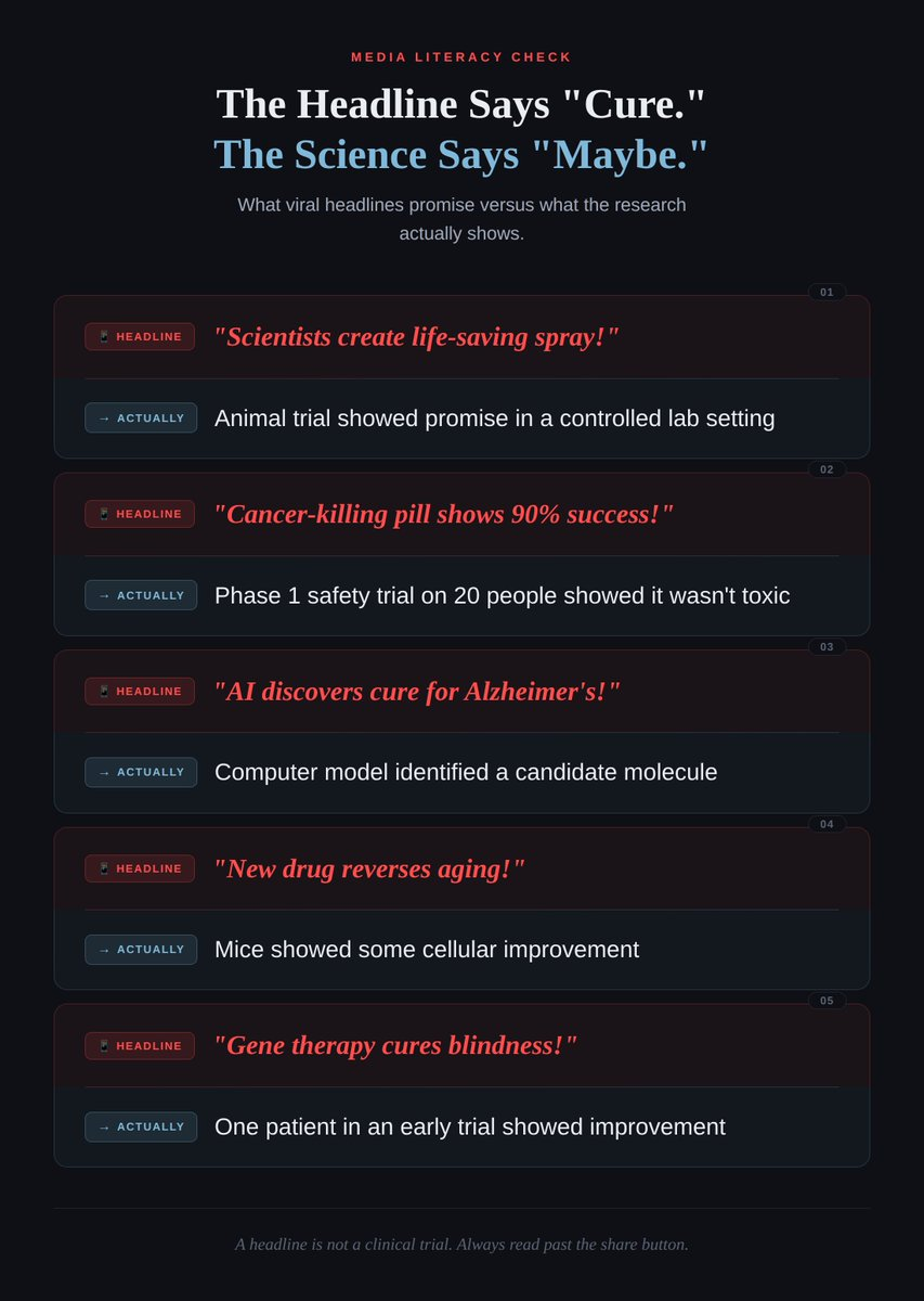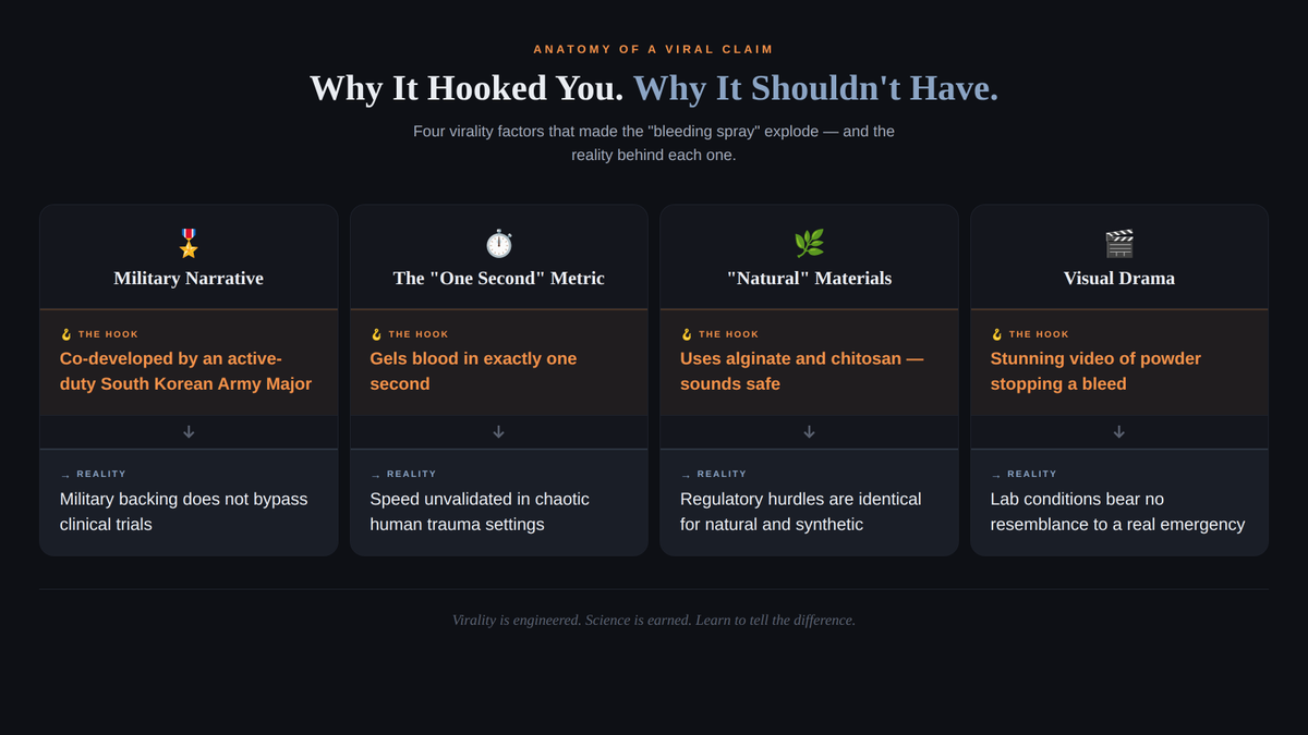 A video of a white powder stopping a deep bleed in one second goes viral on X. A headline claims a "cancer-killing pill" just cleared its first trial. A post announces that AI has found a cure for Alzheimer's.