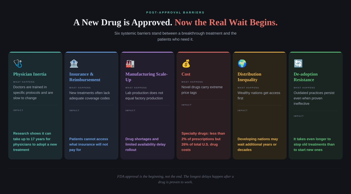 The uncomfortable truth is that even approved, validated treatments can take years or decades to become standard practice. Regulatory approval is not the finish line. It is the starting line of an entirely different race: the race to adoption.
