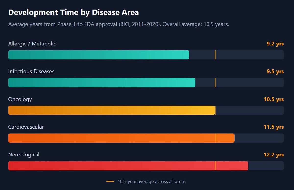 The average time from Phase 1 to regulatory approval is 10.5 years across all disease areas. But that number hides enormous variation.