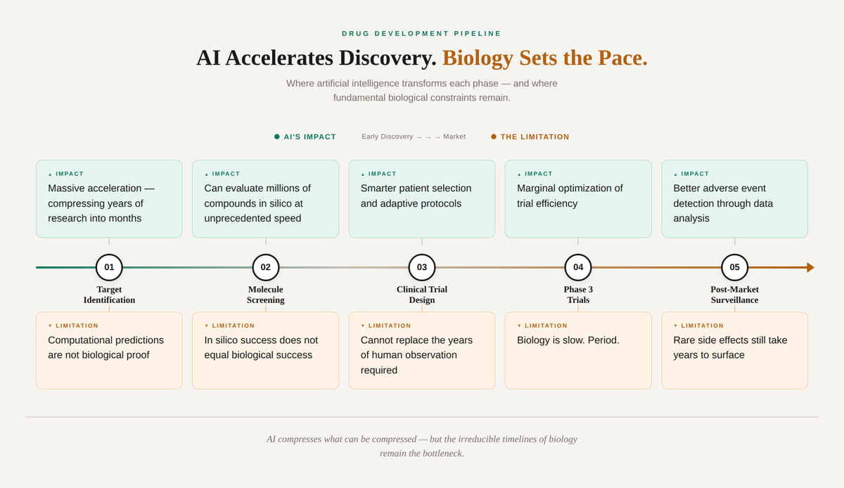 AI is genuinely changing the game in drug discovery, and it would be dishonest to pretend otherwise. With AI-driven platforms, we are finding possible cures faster than ever. Computational models can simulate how a molecule interacts with a protein in milliseconds. The discovery phase that used to take years is being compressed into months.